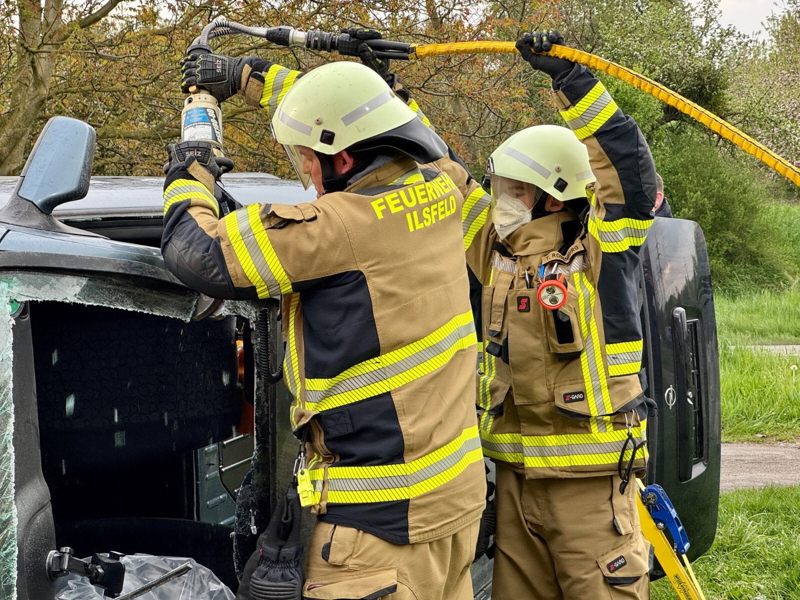 Das HLF20 aus Mundelsheim traf als erstes ein, führte die Brandbekämpfung unter Atemschutz durch und sicherte das Fahrzeug mit einem Stab-Fast-System gegen Umkippen. Etwa acht Minuten später traf die Feuerwehr Ilsfeld ein. Sie schuf eine Erstöffnung und entfernte die Windschutzscheibe. Anschließend wurde das Dach mithilfe von Rettungsschere und Säbelsäge abgeklappt. Gemeinsam mit dem Rettungsdienst konnte die eingeklemmte Person schließlich befreit und weiter versorgt werden.