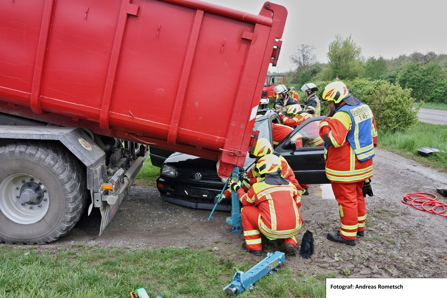 An der zweiten Einsatzstelle war ein PKW unter einen LKW-Anhänger geraten. Der Rüstwagen der Feuerwehr Marbach zog das Fahrzeug hervor, während die Feuerwehr Großbottwar die eingeklemmte Person befreite. Einer der beteiligten Übungsdarsteller hatte bei diesem Einsatz die Aufgabe von der Einsatzstelle zu flüchten. Die Einsatzkräfte hatten somit alle Hände voll zu tun.