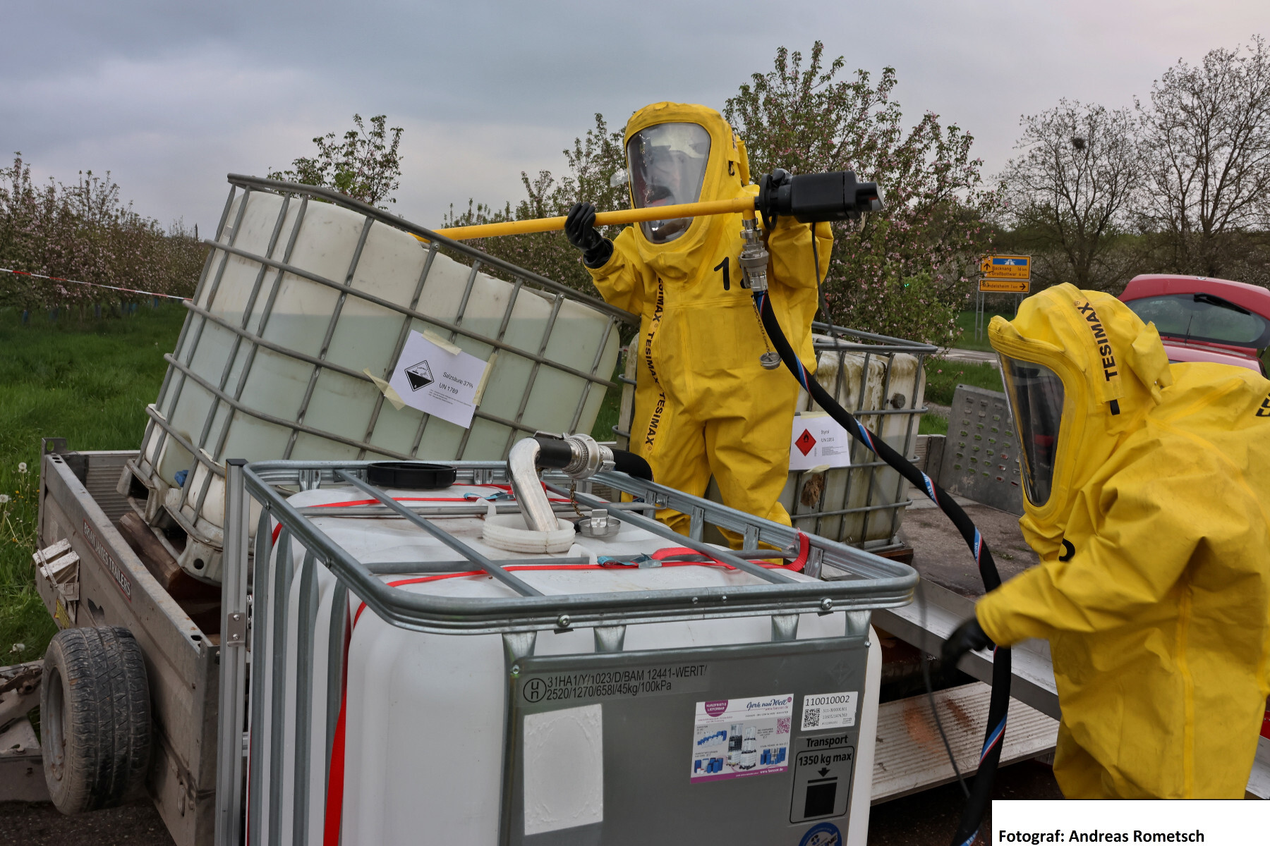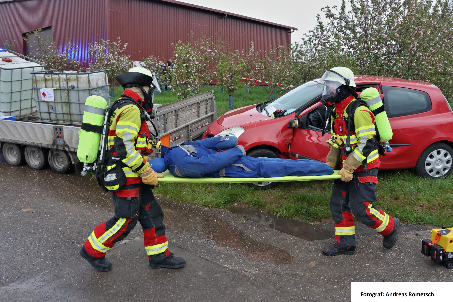 Das dritte Übungsszenario stellte einen Gefahrgutunfall dar. Hier waren das HLF10 der Feuerwehr Mundelsheim und die Feuerwehr Großbottwar im Einsatz. Unterstützung erhielten sie vom Gefahrgutzug aus Asperg. Simuliert war hier ein Zusammenstoß eines PKW mit einem Gefahrgut-LKW. Auf diesem waren Salzsäure und Styrol geladen. beides zusammen bildet gesundheitsschädliche Dämpfe. Die ersteintreffenden Einsatzkräfte mussten hier nach der GAMS-Regel vorgehen: Gefahr erkennen, absperren, Menschen retten und Spezialkräfte anfordern. Diese kamen dann auch mit dem Gefahrgutzug aus Asperg.